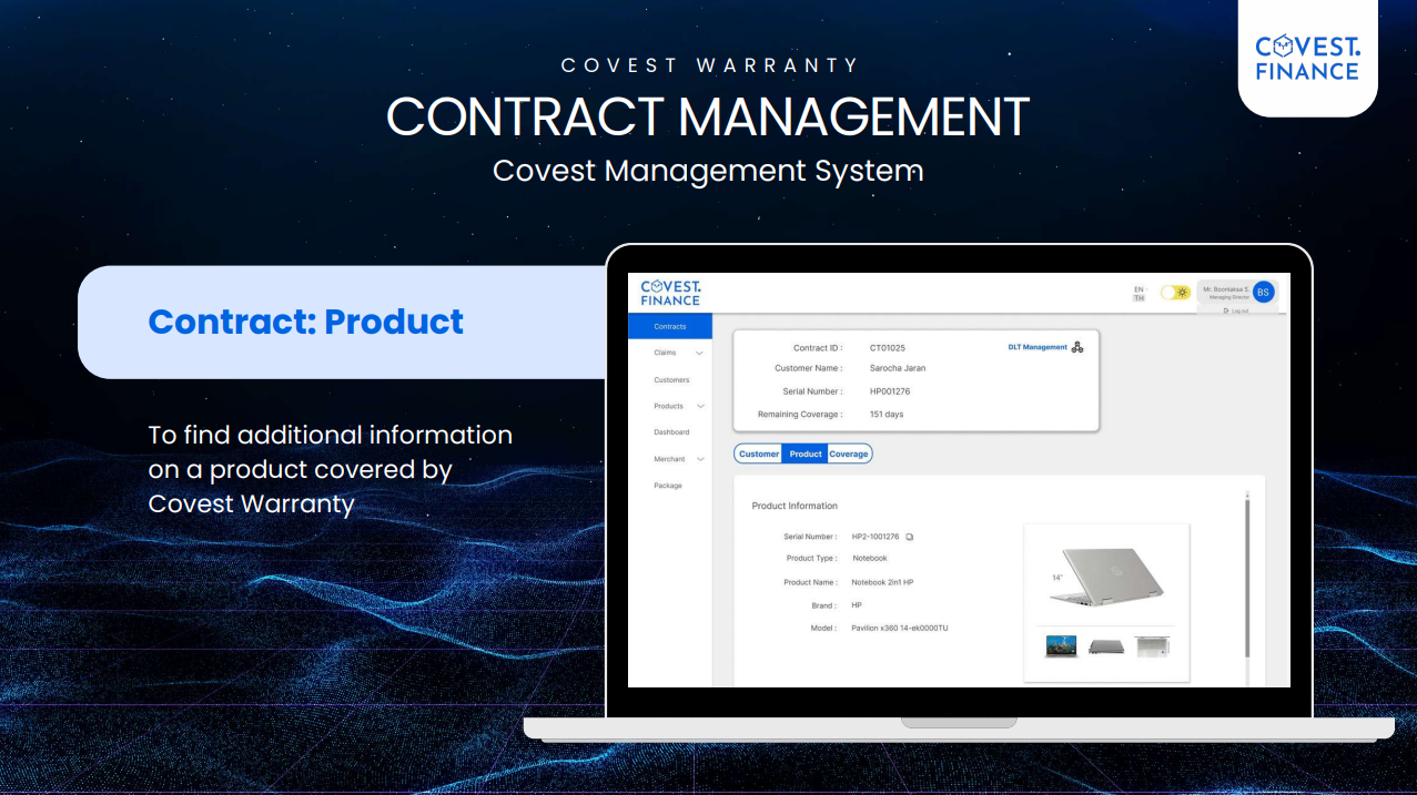The product section offers in-depth information about a specific item that is covered by Covest Warranty. Users can access comprehensive details, including the brand, model, serial number, and other relevant specifications of the product.